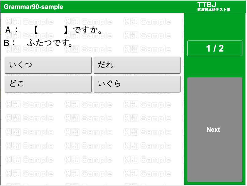 Dieser Test misst Kenntnisse der Grammatik. Dafür sind die passenden Wörter auszuwählen, die in die freie Stelle des Satzes passen. Jeder Satz ist unabhängig von den anderen und steht für sich allein. Angepasst an das jeweilige Niveau wird bei schwierigen Kanji-Zeichen die Aussprache mit Furigana angegeben. Der Test besteht aus drei Abschnitten, jeder Abschnitt mit 30 Aufgaben ist auf zehn Minuten begrenzt. Für alle 90 Aufgaben steht also maximal 30 Minuten Bearbeitungszeit zur Verfügung. Sie können jedoch in Ihrer eigenen Geschwindigkeit antworten. Falls Sie eine Aufgabe nicht lösen können, klicken Sie bitte auf die → [Next]-Schaltfläche und führen Sie den Test bis zu Ende durch.